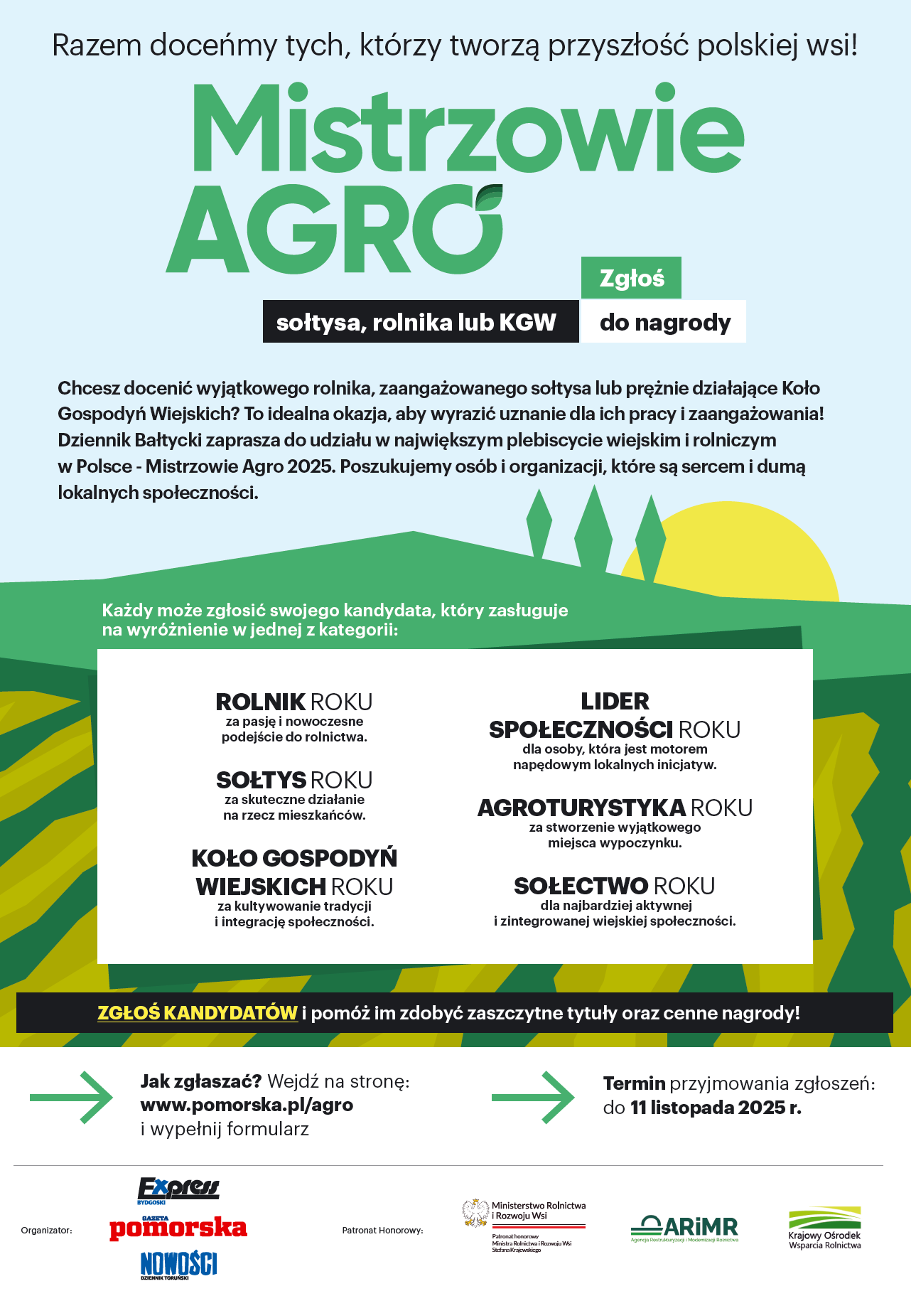 Redakcja „Gazety Pomorskiej”, „Expressu Bydgoskiego” i „Nowości – Dziennika Toruńskiego” informują o rozpoczęciu kolejnej edycji Mistrzów Agro pod patronatem Ministra Rolnictwa i Rozwoju Wsi – Pana Stefana Krajewskiego oraz Prezesa Agencji Restrukturyzacji i Modernizacji Rolnictwa – Pana Wojciecha Legawca. Czytaj dalej
